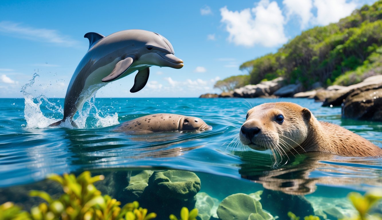 Berbagai mamalia air seperti lumba-lumba, anjing laut, dan dugong di habitat air alami mereka dengan latar belakang vegetasi pantai dan langit biru.